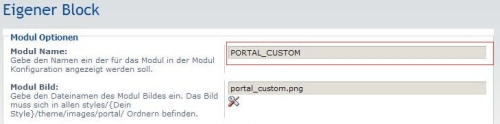 2. Dieser Bilder Block ist der zweite "eigene Block". In der portal_custom_module.php habe ich von "Eigener Block" auf "Info" geändert. Nun heißen aber beide "eigenen Blöcke" so. Kann ich irgendwo jedem eigenen Block einen andereNamen zuweisen?
