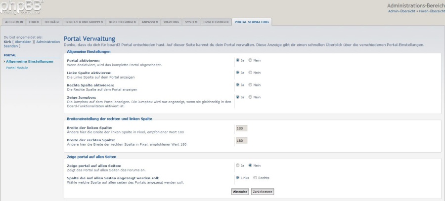 Ich habe versucht, das Modul zu deaktivieren und es neu zu erstellen. Allerdings erfolgt keine Änderung. Wenn ich bei "übergeordnetes Modul" beispielsweise "Allgemein" eintrage, erscheinen die Einträge, die vorher aigentlich im Reiter "Eerweiterungen" erscheinen sollten, unten im Reiter "Allgemeine". Alle Erweiterungen lassen sich nun verändern. Nur der Eintrag "Portal" für auch hier zu einer großen, rechten weissen Seite.