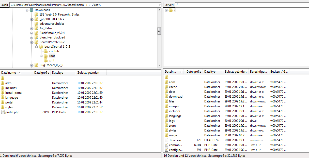 Öffne Filezilla und baue eine Verbindung zu deiner Seite auf und begebe dich zu dem Punkt an dem dein phpBB3 installiert ist. Im linken Teil von Filezilla öffnest du den root-Ordner des Board3 Packets. Das sieht dann so aus: