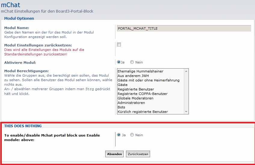 To enable/disable Mchat portal block use Enable module: above:that setting is now REMOVED as it done nothing and was just a placeholder.archivar wrote:What causes this setting? I have the text displayed in---> b3pmchat.phpIs it possible to put the text in a language file?Code: Select all