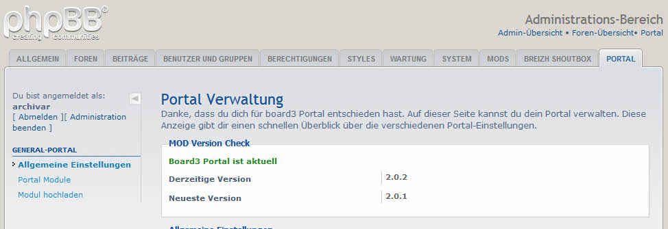Eins der Module darin ist der Menupunkt Portal. Er heißt ACP_PORTAL. Ihm fehlt die Möglichkeit der obersten Kategorie, und gehört deshalb zur zweiten Kategorie. Er hat dann die Unterpunkte die Module Portal Mule, Einstellungen, Modul hochladen.