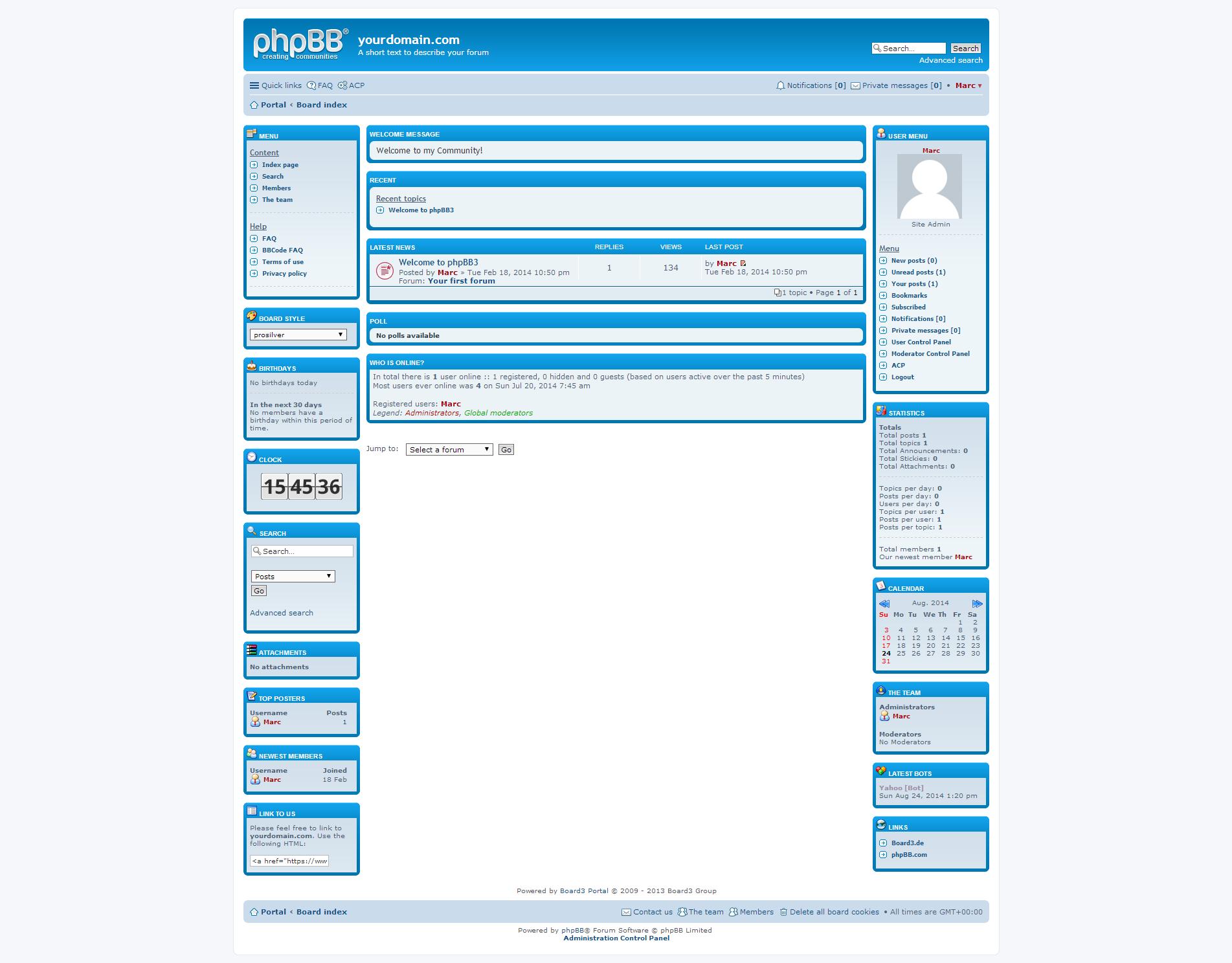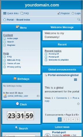 Adds a portal with several modules to your forum. You can change the settings, move the modules, add new modules, and more in the ACP.